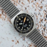 This Seamaster 120 diving model features a 37mm tonneau case, matte black dial with iconic plongeur handset, oversized timing bezel and crown and a gorgeous 'shark mesh' Milanese bracelet with a seatbelt style clasp.